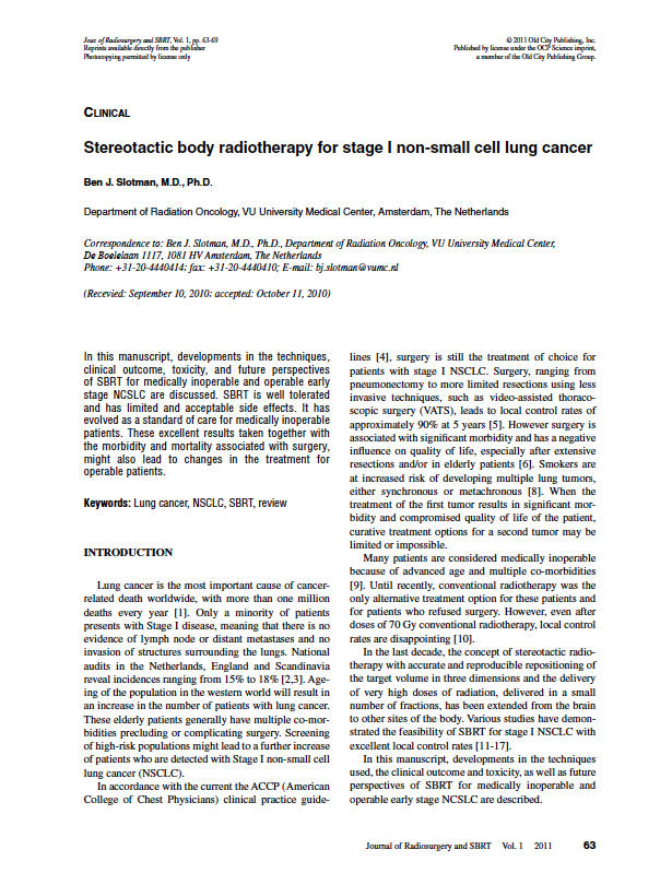 In this manuscript, developments in the techniques, clinical outcome, toxicity, and future perspectives of SBRT for medically inoperable and operable early stage NCSLC are discussed. SBRT is well tolerated and has limited and acceptable side effects. It has evolved as a standard of care for medically inoperable patients. These excellent results taken together with the morbidity and mortality associated with surgery, might also lead to changes in the treatment for operable patients.