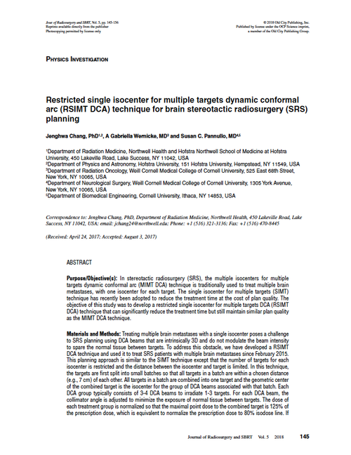 Conclusion: The RSIMT DCA technique can produce satisfactory SRS plans for treating multiple targets and can significantly reduce the treatment time.