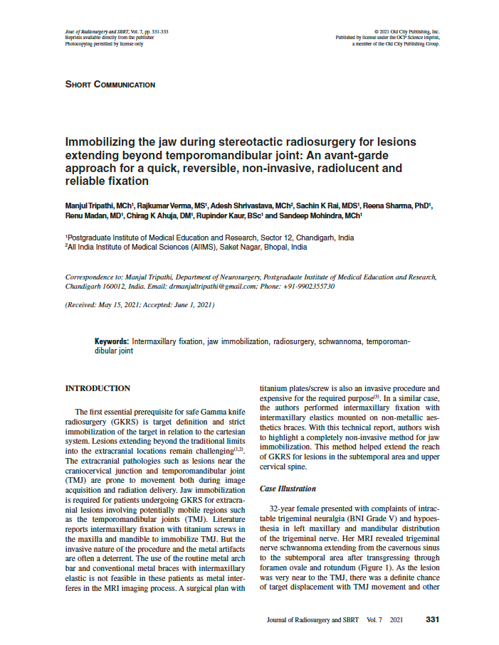 The first essential prerequisite for safe Gamma knife radiosurgery (GKRS) is target definition and strict immobilization of the target in relation to the cartesian system. Lesions extending beyond the traditional limits into the extracranial locations remain challenging(1,2). The extracranial pathologies such as lesions near the craniocervical junction and temporomandibular joint (TMJ) are prone to movement both during image acquisition and radiation delivery. Jaw immobilization is required for patients undergoing GKRS for extracranial lesions involving potentially mobile regions such as the temporomandibular joints (TMJ). Literature reports intermaxillary fixation with titanium screws in the maxilla and mandible to immobilize TMJ. But the invasive nature of the procedure and the metal artifacts are often a deterrent. The use of the routine metal arch bar and conventional metal braces with intermaxillary elastic is not feasible in these patients as metal interferes in the MRI imaging process. A surgical plan with titanium plates/screw is also an invasive procedure and expensive for the required purpose(3). In a similar case, the authors performed intermaxillary fixation with intermaxillary elastics mounted on non-metallic aesthetics braces. With this technical report, authors wish to highlight a completely non-invasive method for jaw immobilization. This method helped extend the reach of GKRS for lesions in the subtemporal area and upper cervical spine.