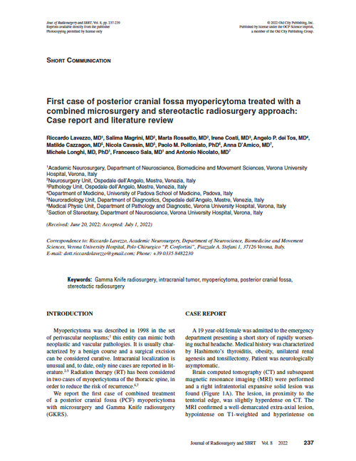 Myopericytoma was described in 1998 in the set of perivascular neoplasms;1 this entity can mimic both neoplastic and vascular pathologies. It is usually characterized by a benign course and a surgical excision can be considered curative. Intracranial localization is unusual and, to date, only nine cases are reported in literature.2-5 Radiation therapy (RT) has been considered in two cases of myopericytoma of the thoracic spine, in order to reduce the risk of recurrence.6,7